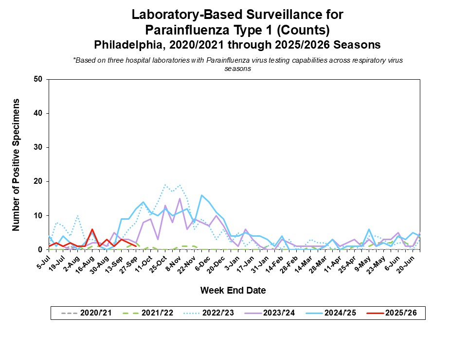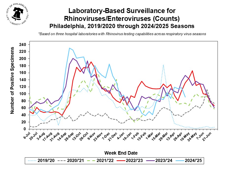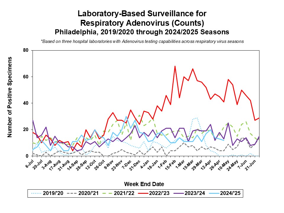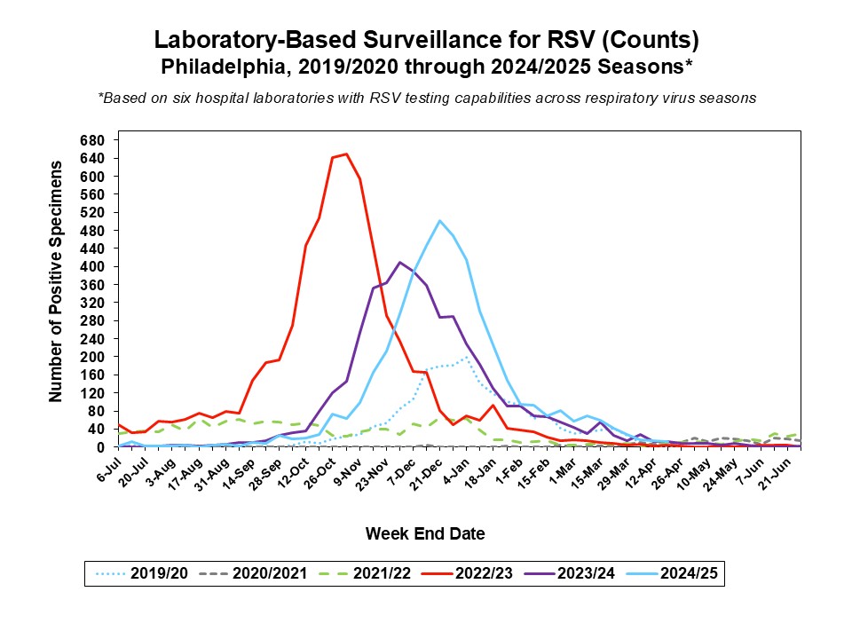 The following graphs depict the aggregate results of PDPH's respiratory virus surveillance. Care should be taken with the interpretation of these results. These summaries display the provisional, year-to-date counts (or, in some cases, percentage positivity) of respiratory viruses by week of report. Comparable data for preceding years are shown as well. All surveillance data are preliminary and are not intended for further distribution.