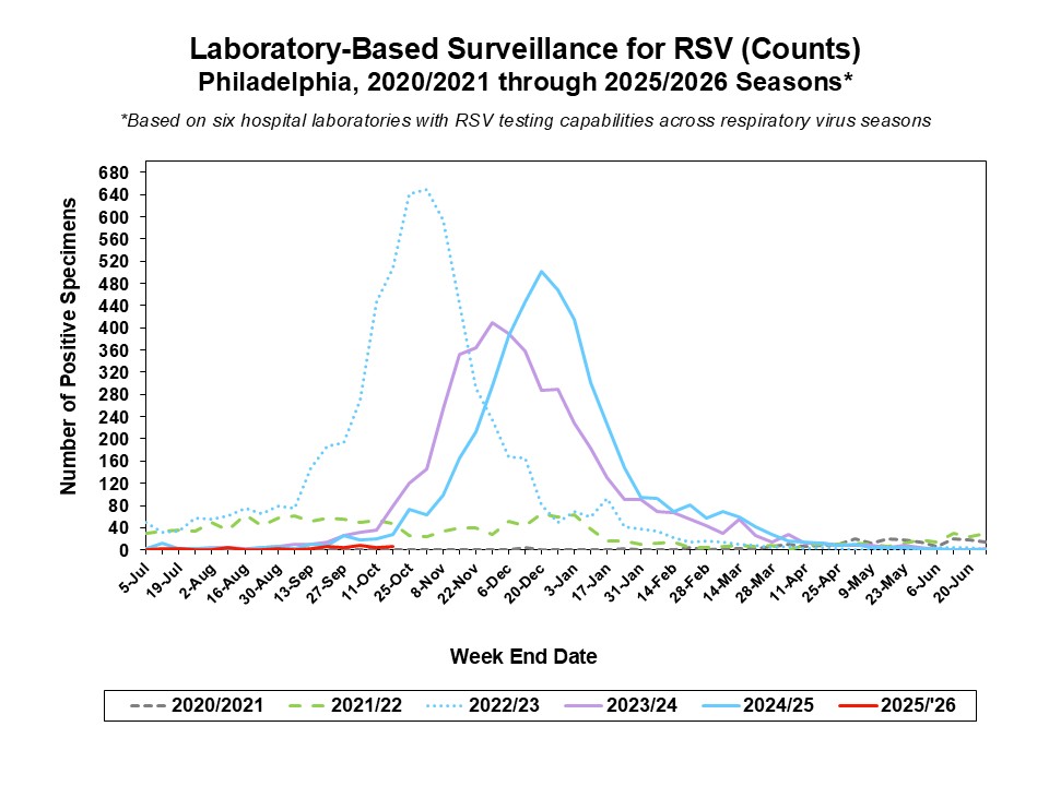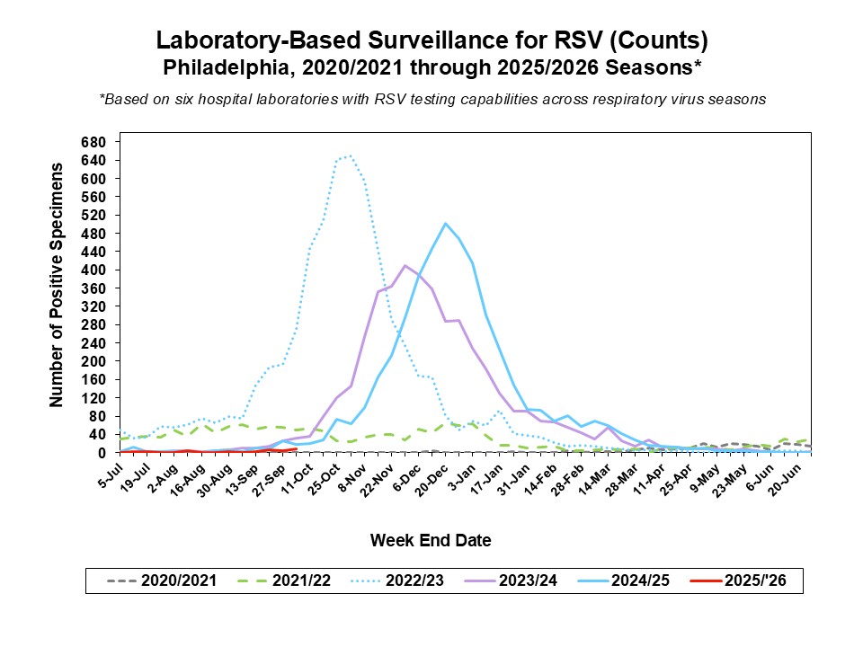 For week 4 of 2025, RSV activity decreased, with 5% (148/2806) of specimens testing positive. Rhinovirus/enterovirus activity increased slightly but remained lower than what was reported in Fall 2024 and is leveling off. Adenovirus activity also increased slightly compared to levels reported in week 3. Human metapneumovirus and parainfluenza virus activity remained low with levels similar to previous weeks.
