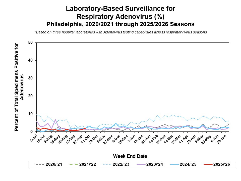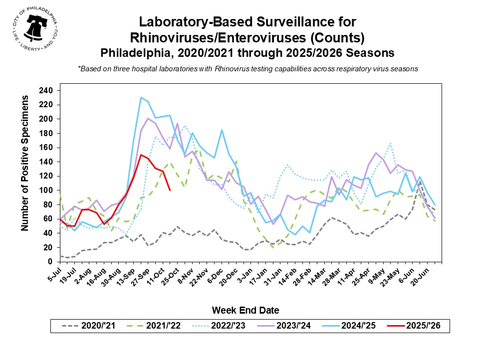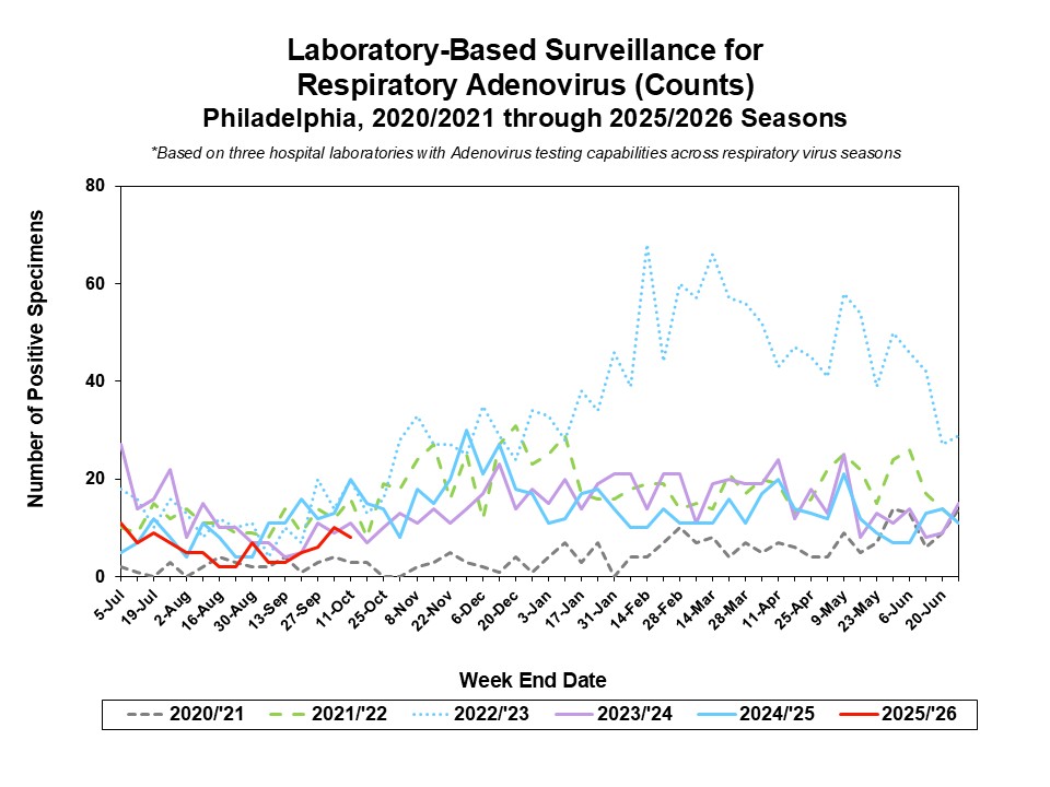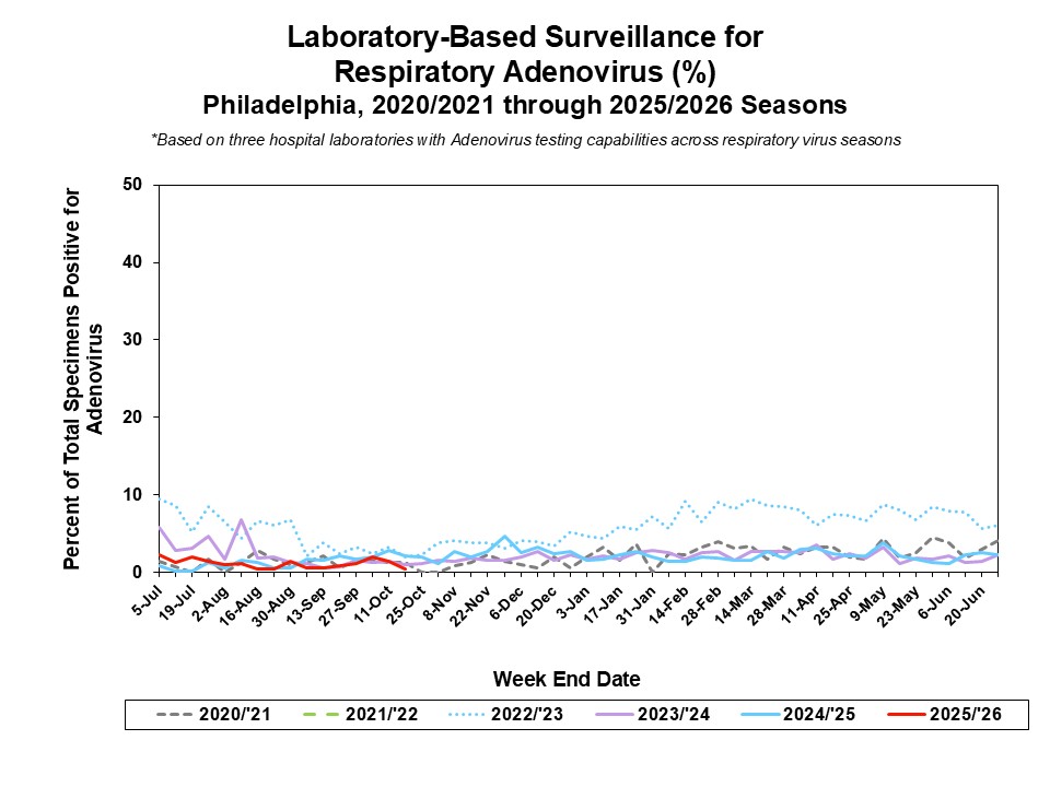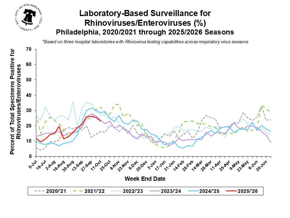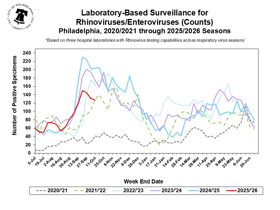 For week 40 of 2025, rhinovirus/enterovirus activity decreased but remained high, with levels similar to this time last season. Adenovirus activity has increased slightly over the past three weeks, with 10 total positive specimens reported and a percent positivity of 2.0% during week 40. RSV, HMPV, and parainfluenza virus 1, 2, and 3 activities all remained low, consistent with the past several weeks.