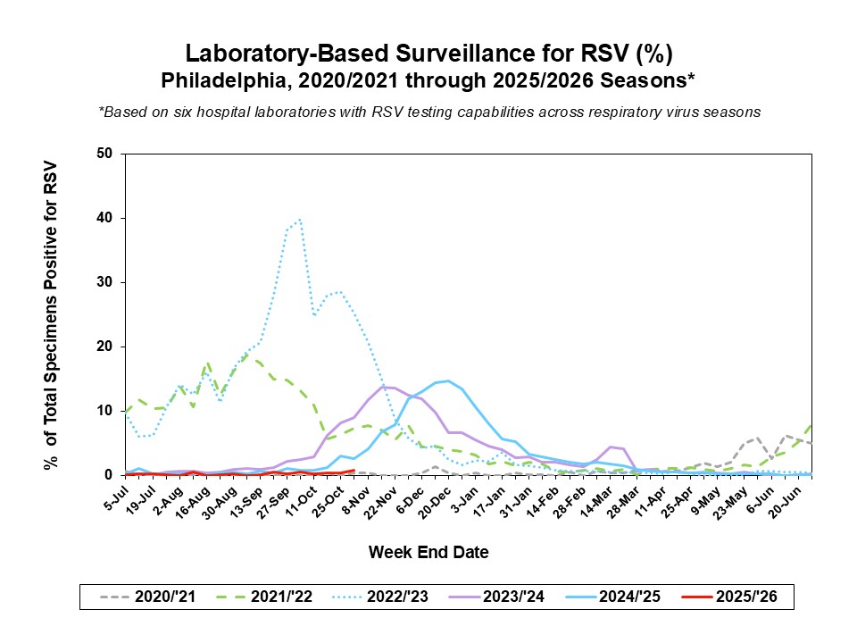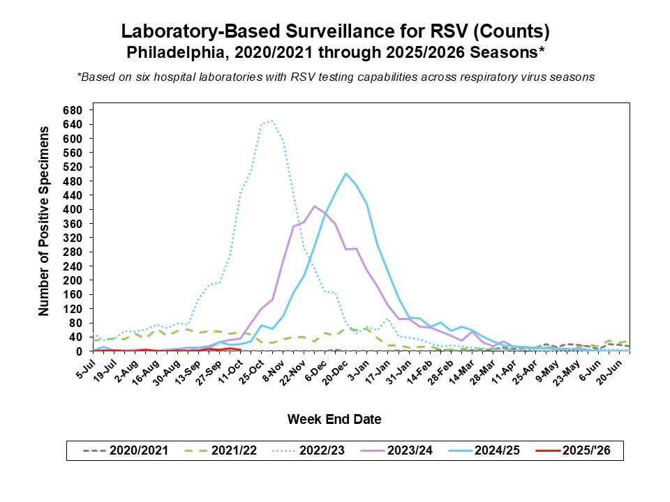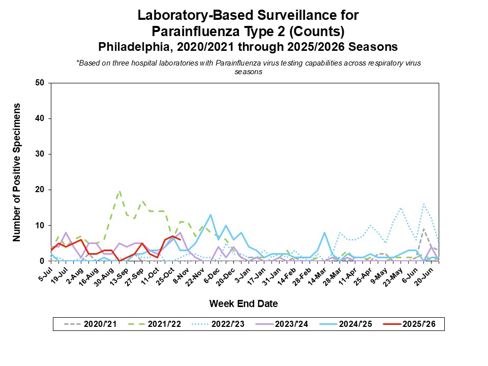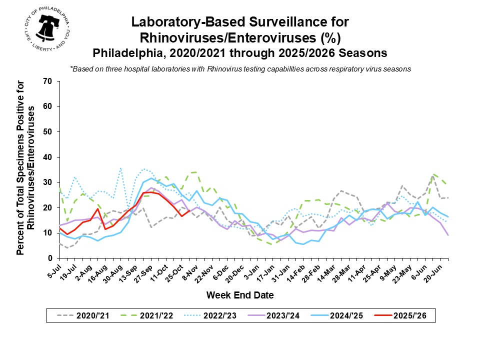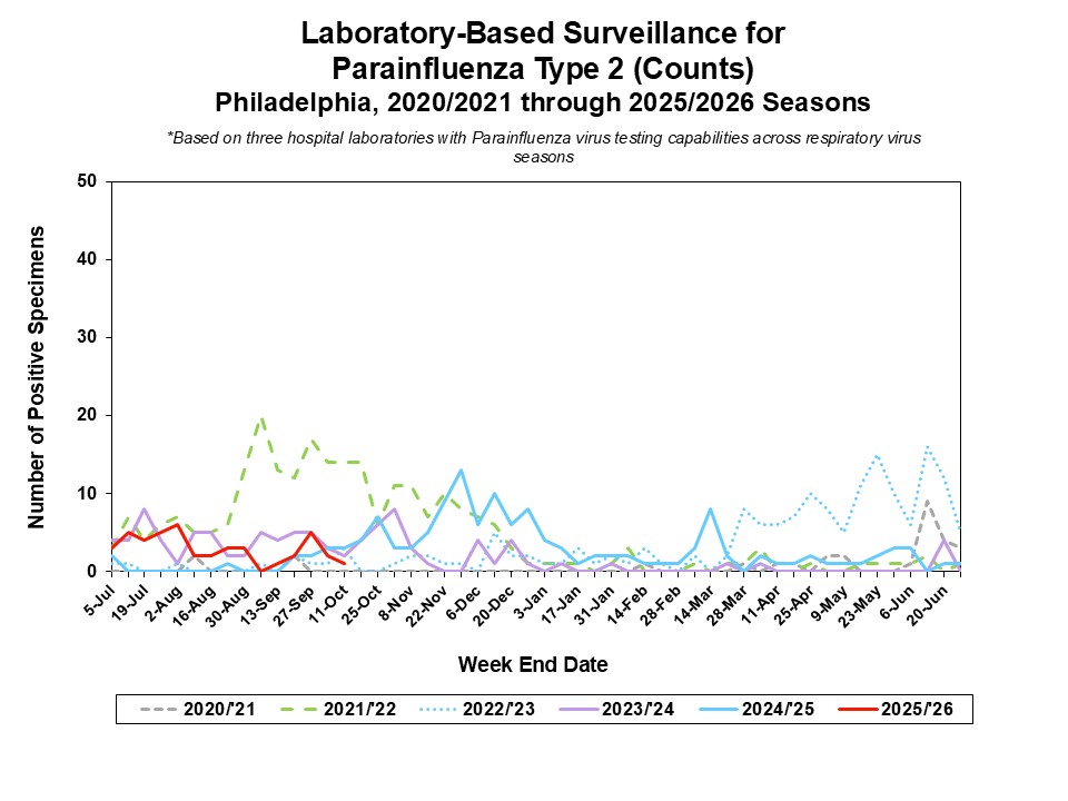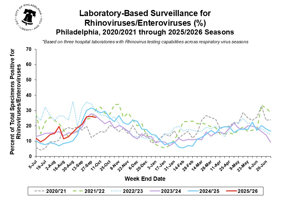 For week 40 of 2025, rhinovirus/enterovirus activity decreased but remained high, with levels similar to this time last season. Adenovirus activity has increased slightly over the past three weeks, with 10 total positive specimens reported and a percent positivity of 2.0% during week 40. RSV, HMPV, and parainfluenza virus 1, 2, and 3 activities all remained low, consistent with the past several weeks.