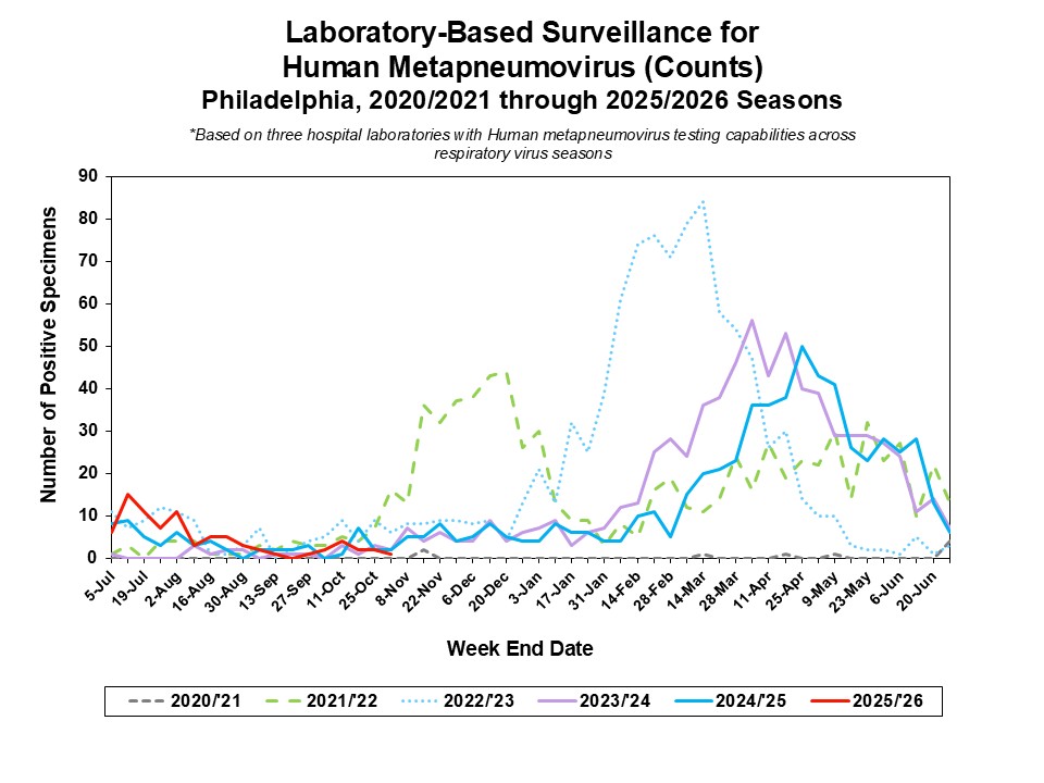For week 26 of 2025, rhinovirus/enterovirus activity decreased but remained high compared to other respiratory viruses. Parainfluenza virus 3 activity increased and remained high. Human metapneumovirus activity has decreased each of the past two weeks, with levels similar to this time last season. RSV, adenovirus, and parainfluenza virus 1 and 2 activities have all remained low over the past several weeks.