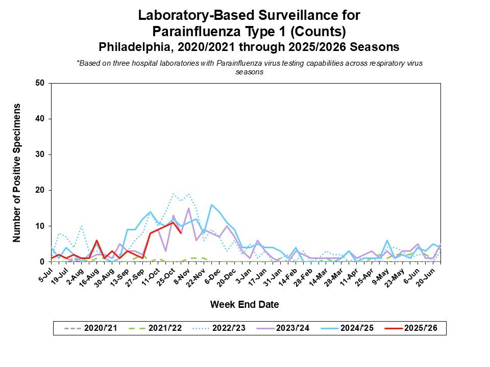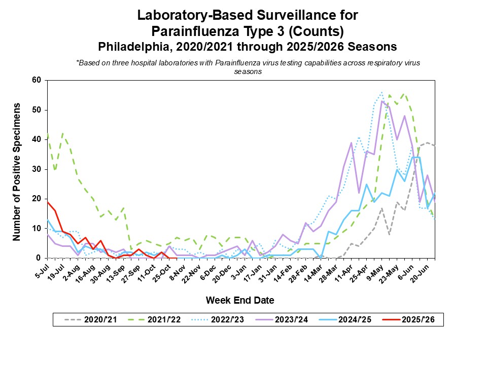 For week 43 of 2025, rhinovirus/enterovirus activity decreased but remained high overall. Parainfluenza virus 1 activity remained higher, with 11 total positive specimens reported and a percent positivity of 2%. RSV, Adenovirus, HMPV, and parainfluenza virus 1 and 3 activities all remained low, consistent with the past several weeks.