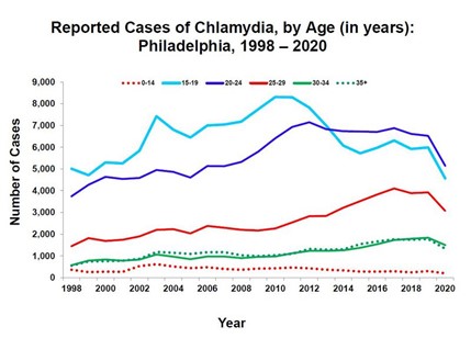 Chlamydia is the most commonly reported infectious disease in the city of Philadelphia. Rates of reported chlamydia infection are consistently higher in women than in men and are highest in the 15- to 19-year-old age group. Untreated chlamydia may lead to PID, infertility, and increase the chance of ectopic pregnancy. For more information, visit the chlamydia webpage or Take Control Philly.