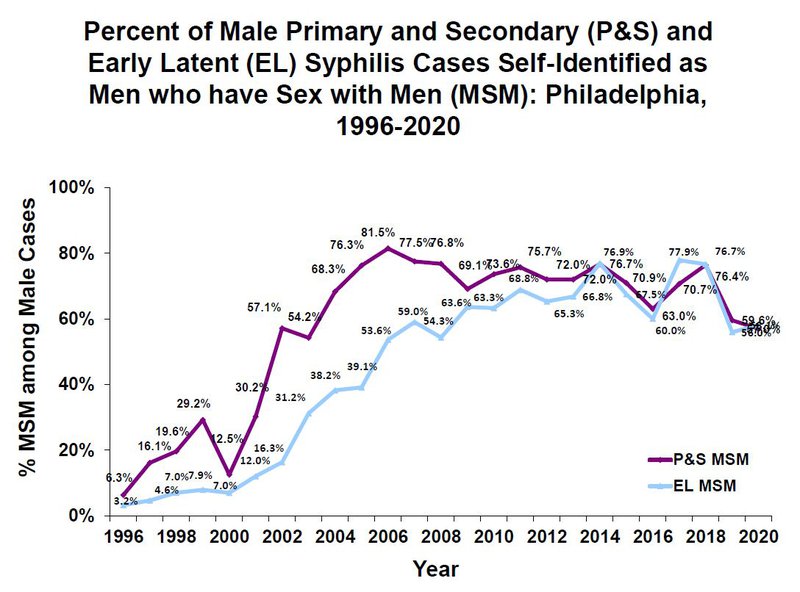 Percentage of male P/S and early latent syphilis as MSM, 1996-2020